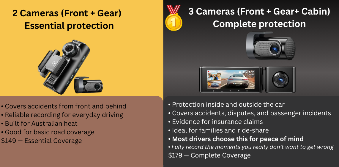 - Rear camera: 1080P (for 2-cam) or additional inside/cabin camera (for 3-cam)